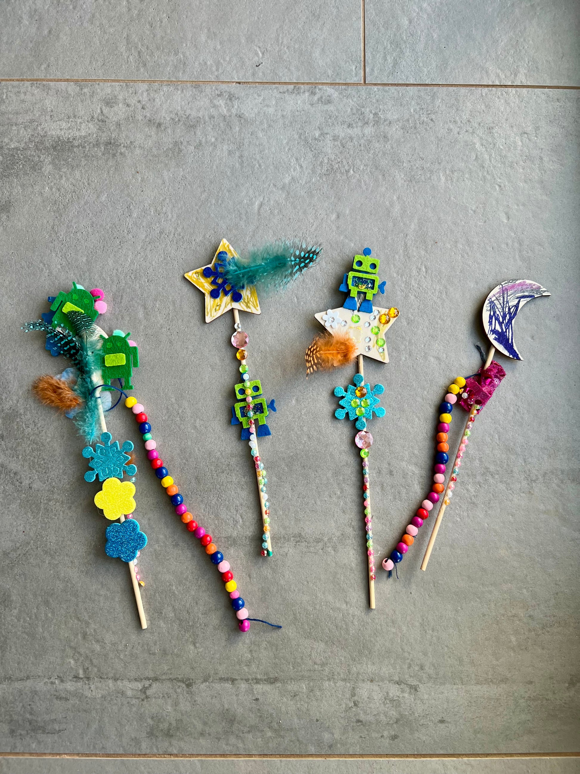 - Verzierungen für Zauberstäbe (Bänder, Perlen, Federn, Aufkleber, etc.)