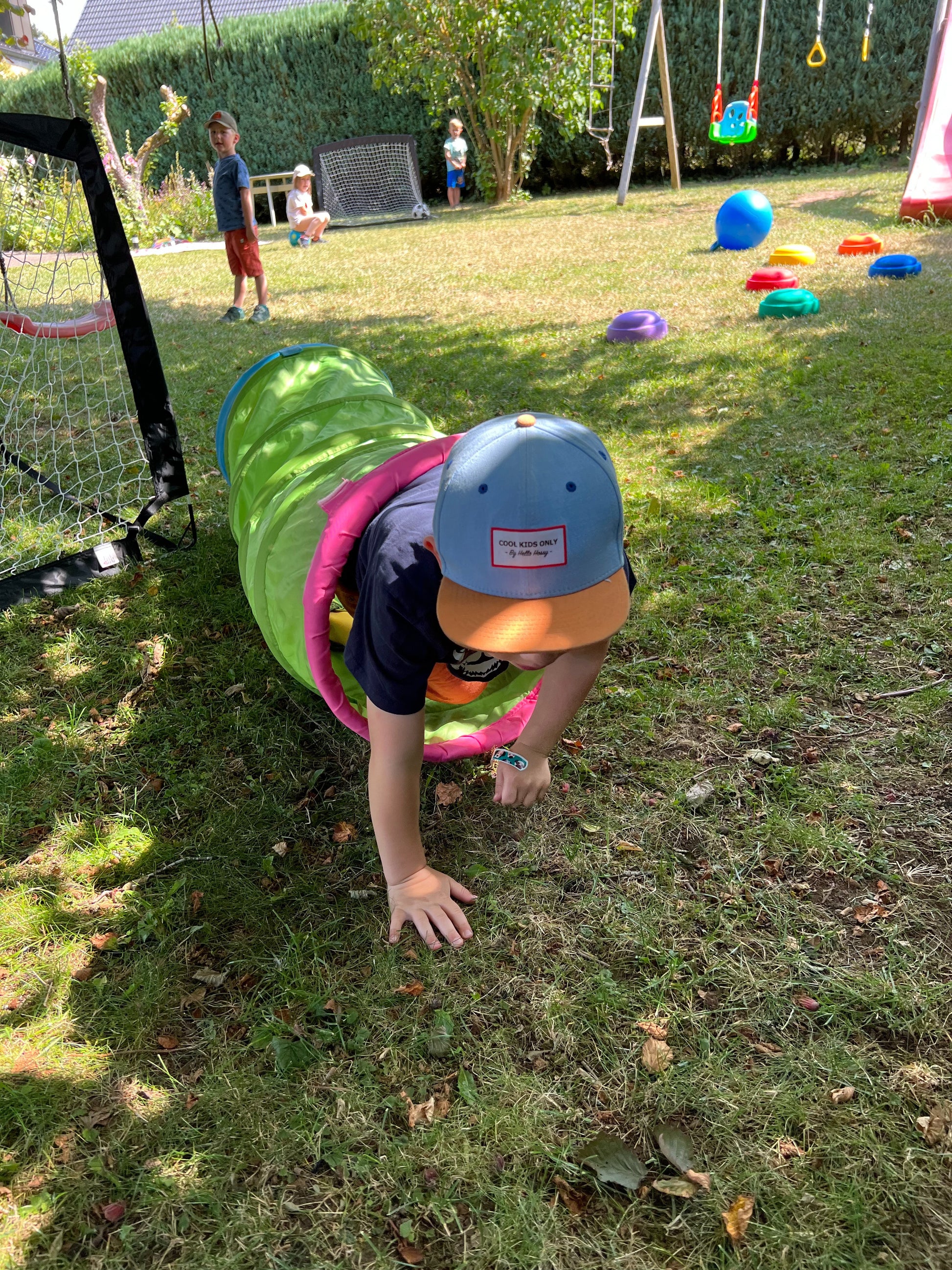 - Hindernisse für die sportliche Prüfung (z.B. Stapelsteine, Krabbeltunnel, Pappkartons zum Darüberhüpfen, Slalomstangen, Bobbycar, etc.)